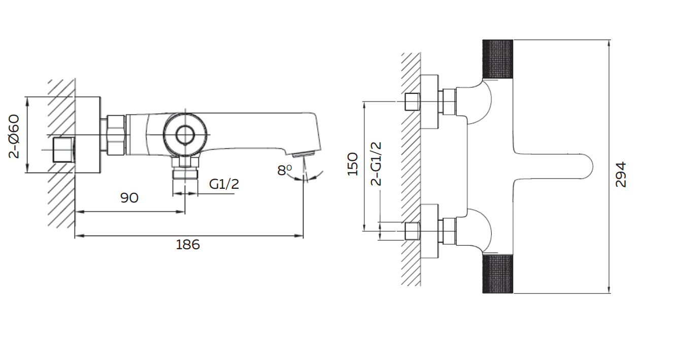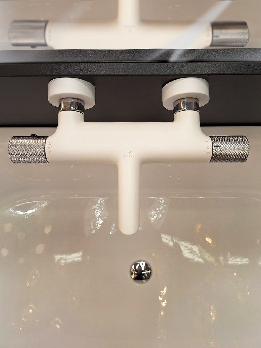 Комплектация: термостатический смеситель настенного монтажа, аэратор, эксцентрики, чаши декоративные